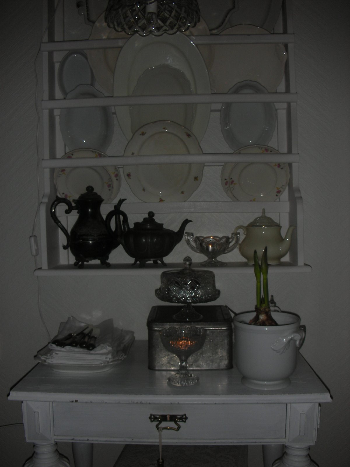 Ljusstakar från IKEA och Lillboden, Hjärtkrans från Sia, Ljuslycktor från Sia, änglar från Christina Schollin och sist ett par ljusstakar från Sia, hylla från IKEA